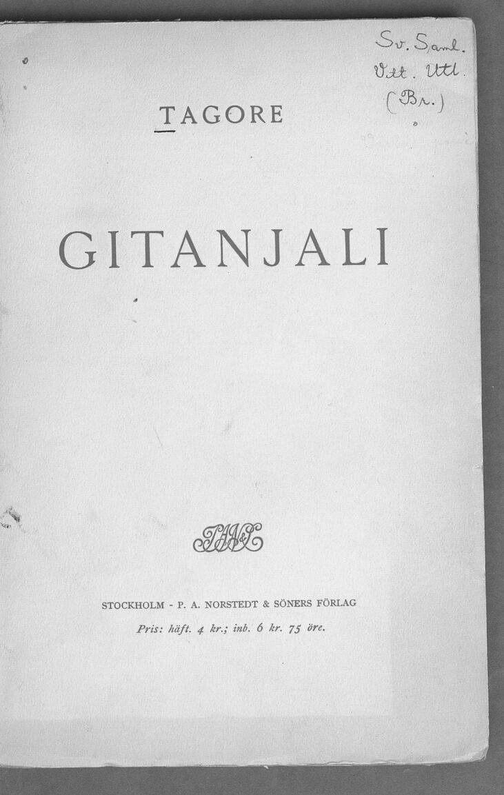 (1861-1941). Versionen som presenteras nedan översattes till svenska av Andrea Butenschön (1886-1948) och innehåller de 38 första tolkningarna. Tagore tilldelades Nobelpriset i litteratur 1913 för Gitanjali.