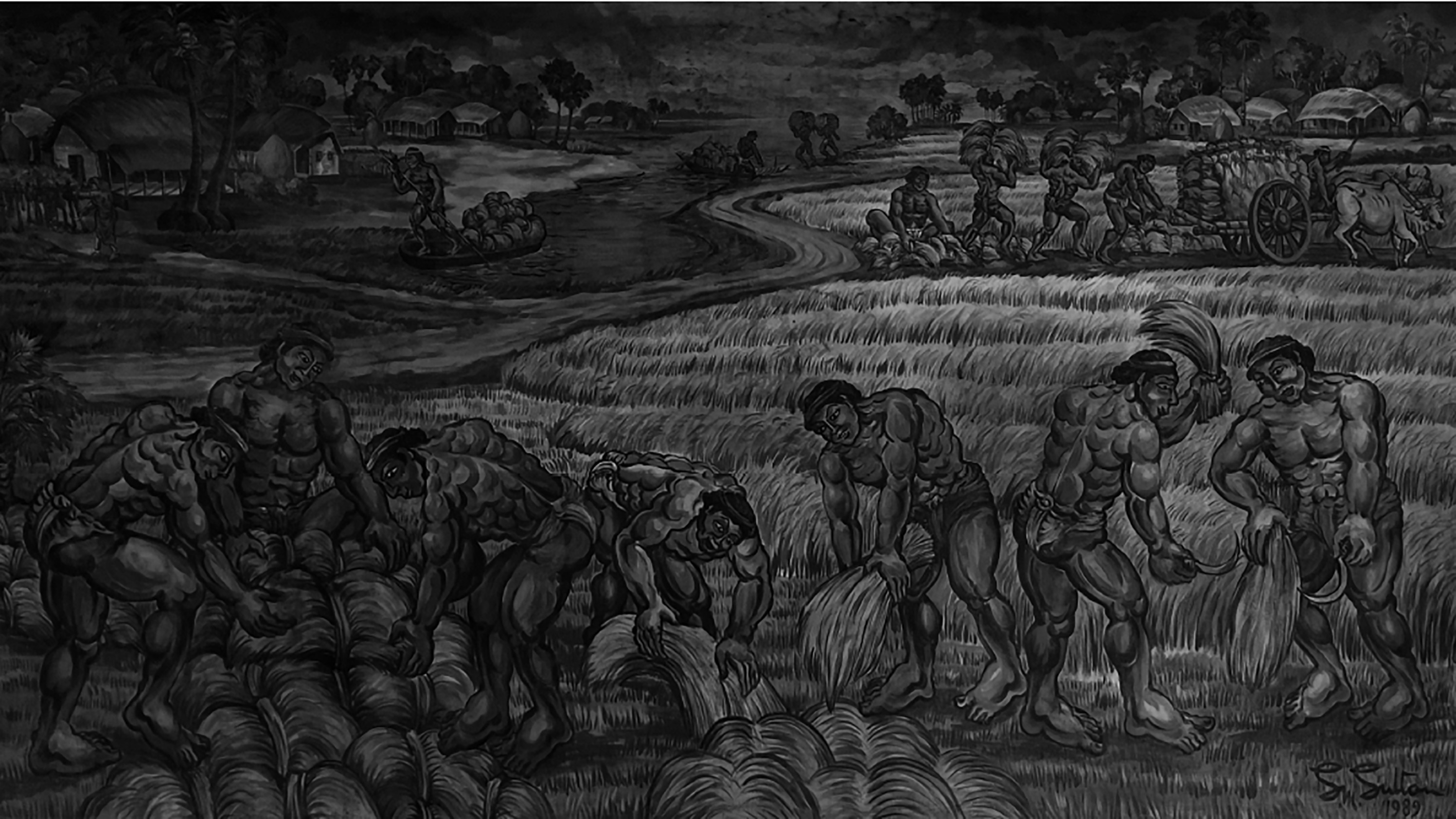 In another of Sultan’s oil paintings, also titled “Cultivation,” he depicts farmers utilising chisels to harvest paddy in a field. Several other peasants are seen carrying large bundles of paddy on their heads. Adjacent to the field, a blue canal flows, while green trees and huts are visible in the background. The sky above is a blend of blue and white, contributing to the overall atmosphere of solitude and serenity. Sultan skillfully maintains a harmony between the individual and their environment, which is a key part of the vitality in rural life. The figures in his artwork exhibit a solemn demeanour, with their traits accentuated. The use of lighting is a significant aspect of the painting, as the artist typically favours incandescent illumination and an enigmatic ambience.